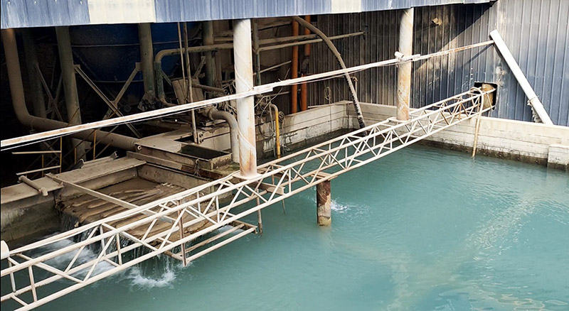 洗砂污水通過(guò)回收裝置溢流進(jìn)入污水池,經(jīng)加藥泵給三氫凈化體中污水添加絮凝劑,使泥污快速凝結(jié)沉淀,對(duì)污水進(jìn)行初步分離——泥漿下沉、清水通過(guò)溢流槽流出,經(jīng)管道重新返回清水池,進(jìn)行循環(huán)利用。