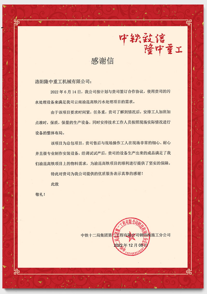 不久前,隆中重工收到了一份紙輕情義重的感謝信,渝昆高鐵項(xiàng)目見證了中鐵十二局與隆中重工之間合作、共贏與友誼關(guān)系的蛻變。