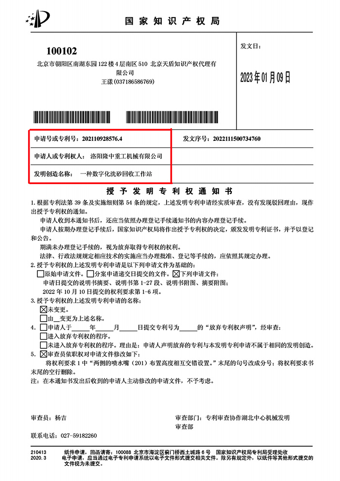 新年伊始,***知識(shí)產(chǎn)權(quán)局下發(fā)“授予發(fā)明專利權(quán)通知書(專利號(hào):202110928576.4),授予隆中重工“一種數(shù)字化洗砂回收工作站”發(fā)明專利。
